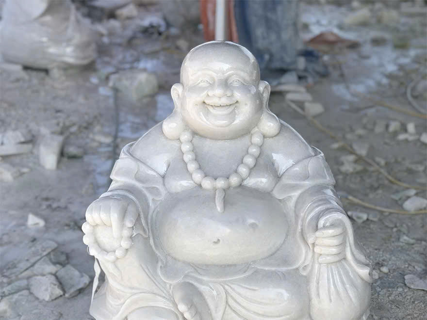 Tượng điêu khắc Phật Di Lặc ngồi trên đài sen bằng đá trắng nguyên khối với thân hình mập mạp, bụng lớn, mặt tròn trịa, và nụ cười rạng rỡ, hoan hỉ. Đây là hình ảnh đặc trưng của ngài, biểu tượng cho sự an lạc, vui vẻ.