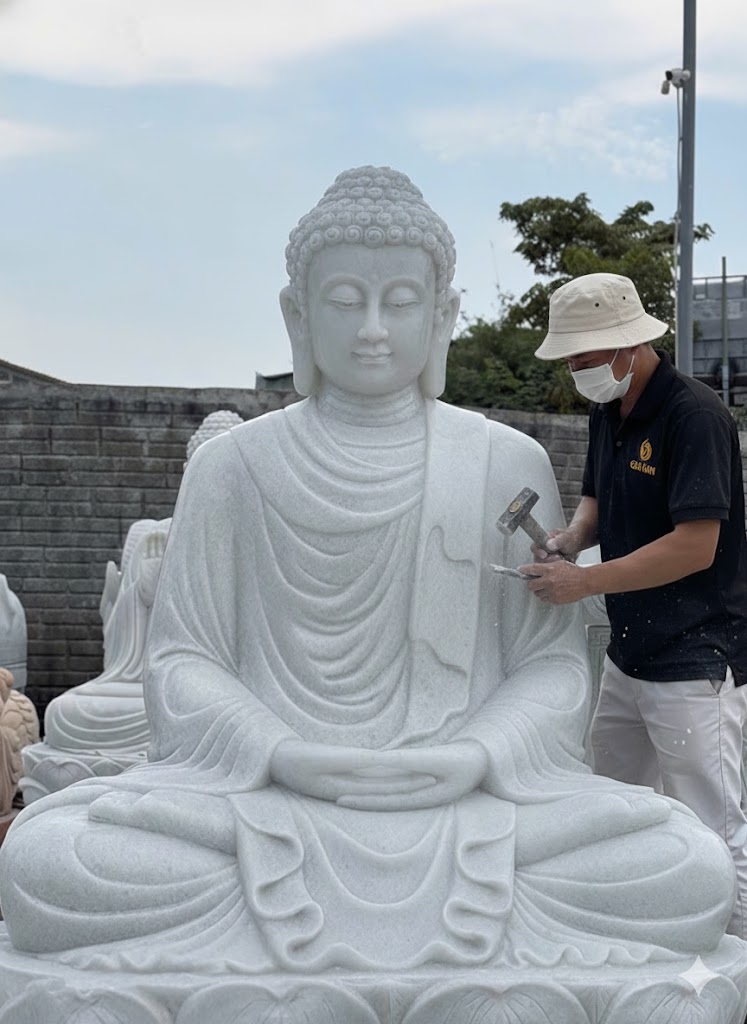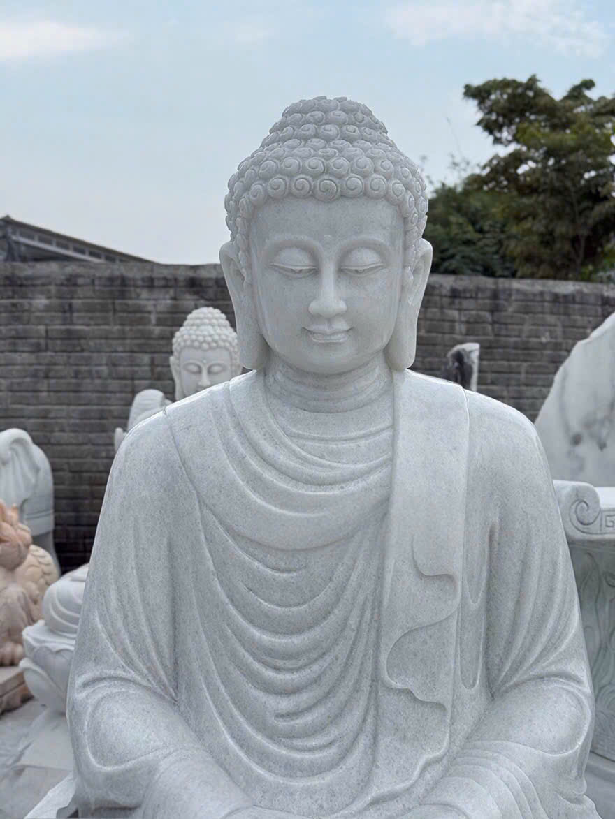 Tượng PhẬT THÍCH CA ngồi được chế tác tinh xảo từ đá trắng nguyên khối tự nhiên.biểu trưng cho sự thanh tịnh và giác ngộ. thể hiện thần thái từ bi, an nhiên và trí tuệ của Đức Phật