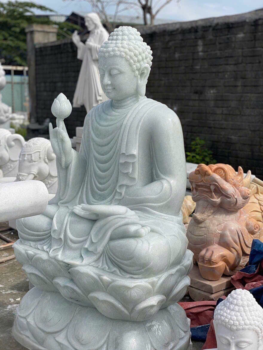 • Tượng Phật THÍCH CA ngồi được chế tác tinh xảo từ đá trắng nguyên khối tự nhiên, mang sắc trắng thuần khiết, biểu trưng cho sự thanh tịnh và giác ngộ. Từng đường nét chạm khắc trên khuôn mặt, nếp áo và hoa sen đều được nghệ nhân thực hiện tỉ mỉ bằng tay, thể hiện thần thái từ bi, an nhiên và trí tuệ của Đức Phật.