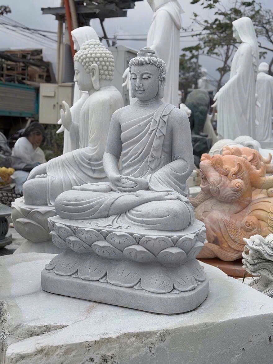 • Tượng Phật THÍCH CA ngồi được chế tác tinh xảo từ đá trắng nguyên khối tự nhiên, mang sắc trắng thuần khiết, biểu trưng cho sự thanh tịnh và giác ngộ. Từng đường nét chạm khắc trên khuôn mặt, nếp áo và hoa sen đều được nghệ nhân thực hiện tỉ mỉ bằng tay, thể hiện thần thái từ bi, an nhiên và trí tuệ của Đức Phật.